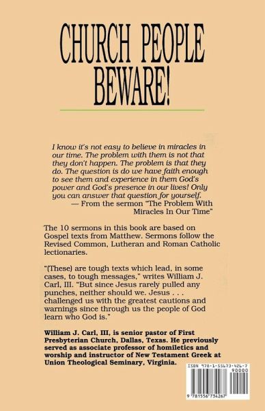 I know it's not easy to believe in miracles in our time. The problem with them is not that they don't happen. The problem is that they do. The question is do we have faith enough to see them and experience them and God's presence in our lives! Only you can answer that question for yourself. -- from the sermon "The Problem With Miracles In Our Time" The ten sermons in this book are based on Gospel texts from Matthew. Homilies follow the Roman Catholic, Revised Common, and Lutheran lectionaries. "(These) are tough texts which lead, in some cases, to tough messages," writes Carl. "But since Jesus rarely pulled any punches, neither should we. Jesus... challenged us with the greatest cautions and warnings, since through us the people of God learn who God is." William J. Carl III, Dallas, Texas, has served as associate professor of homiletics and worship instructor of New Testament Greek at Union Theological Seminary, Virginia.