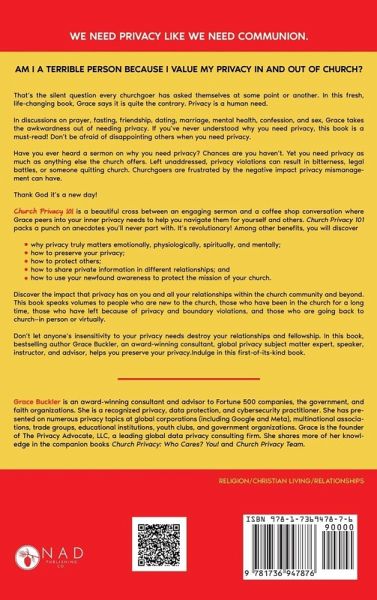 Church Privacy 101: Preserving Dignity. Strengthening Relationships. In the bustling world of church life, privacy often takes a backseat. But what if valuing privacy wasn't selfish, but essential for fostering healthy relationships and safeguarding dignity? In "Church Privacy 101," Grace Buckler, a renowned global privacy expert, dismantles the stigma surrounding privacy needs within the church community. With refreshing clarity and practical wisdom, Grace navigates the delicate balance between transparency and discretion, offering actionable advice on preserving personal boundaries while respecting the privacy of others. From discussions on prayer, friendship, and mental health to navigating church dynamics, this groundbreaking book empowers churchgoers and ministry leaders alike to cultivate a culture of mutual respect and understanding. If you've ever felt hesitant about prioritizing your privacy within the church or struggled with boundary violations, "Church Privacy 101" is your indispensable guide to reclaiming autonomy, fostering deeper connections, and preserving the sanctity of personal space within the sacred community. Join Grace Buckler on this transformative journey and unlock the power of privacy for a more authentic, fulfilling church experience.