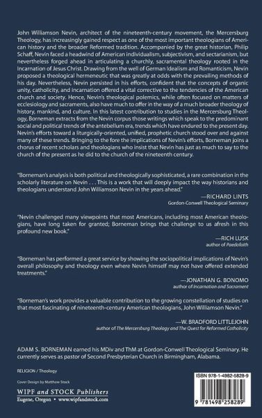 John Williamson Nevin, architect of the nineteenth-century movement, the Mercersburg Theology, has increasingly gained respect as one of the most important theologians of American history and the broader Reformed tradition. Accompanied by the great historian, Philip Schaff, Nevin faced a headwind of American individualism, subjectivism, and sectarianism, but nevertheless forged ahead in articulating a churchly, sacramental theology rooted in the Incarnation of Jesus Christ. Drawing from the well of German Idealism and Romanticism, Nevin proposed a theological hermeneutic that was greatly at odds with the prevailing methods of his day. Nevertheless, Nevin persisted in his efforts, confident that the concepts of organic unity, catholicity, and incarnation offered a vital corrective to the tendencies of the American church and society. Hence, Nevin's theological polemics, while often focused on matters of ecclesiology and sacraments, also have much to offer in the way of a much broader theology of history, mankind, and culture. In this latest contribution to studies in the Mercersburg Theology, Borneman extracts from the Nevin corpus those writings which speak to the predominant social and political trends of the antebellum era, trends which have endured to the present day. Nevin's efforts toward a liturgically-oriented, unified, prophetic church stood over and against many of these trends. Bringing to the fore the implications of Nevin's efforts, Borneman joins a chorus of recent scholars and theologians who insist that Nevin has just as much to say to the church of the present as he did to the church of the nineteenth century.