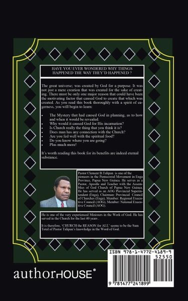 HAVE YOU EVER WONDERED WHY THINGS HAPPENED THE WAY THEY'D HAPPENED ? The great universe; was created by God for a purpose. It was not a mere creation that was created for the sake of creating. There must be one and only one major reason that could have motivated the Almighty God to create that which was created. As you read this book thoroughly with a spirit of eagerness, you will begin to learn: ¿ The Mystery that had caused God in planning, as to how and when it would be revealed. ¿ Why would it caused God for His incarnation? ¿ Is Church really the thing that you think it is? ¿ Does man has any connection with the Church? ¿ Are you fed well with the spiritual food? ¿ Do you know where you are going? ¿ Plus much more! It's worth reading this book for its benefits are indeed eternal substance.