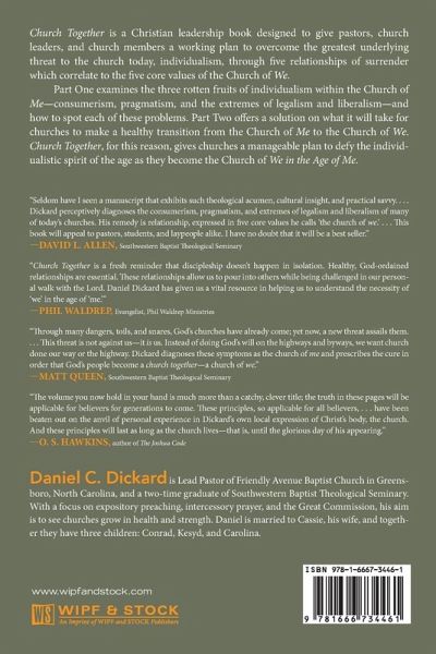 Church Together is a Christian leadership book designed to give pastors, church leaders, and church members a working plan to overcome the greatest underlying threat to the church today, individualism, through five relationships of surrender which correlate to the five core values of the Church of We. Part One examines the three rotten fruits of individualism within the Church of Me--consumerism, pragmatism, and the extremes of legalism and liberalism--and how to spot each of these problems. Part Two offers a solution on what it will take for churches to make a healthy transition from the Church of Me to the Church of We. Church Together, for this reason, gives churches a manageable plan to defy the individualistic spirit of the age as they become the Church of We in the Age of Me.