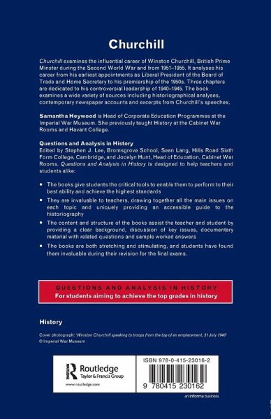 Churchill examines the influential career of Winston Churchill, British Prime Minster during the Second World War and from 1951-55. It discusses his early career as Secretary of State for War and Air and Chancellor of the Exchequer, Churchill as Warlord, and Churchill in opposition and the 1951 government. The book examines a wide variety of sources from contemporary newspaper accounts to Churchill's letters to his wife.
