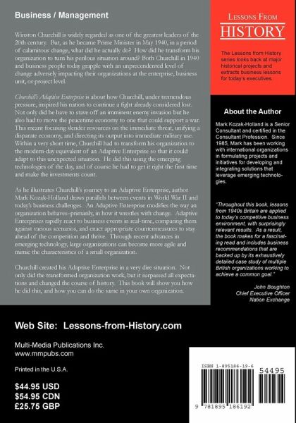Winston Churchill is widely regarded as one of the greatest leaders of the 20th century. But as he became Prime Minister in May 1940, in a period of calamitous change, what did he actually do? How did he transform his organization to turn his perilous situation around? Both Churchill in 1940 and business people today grapple with an unprecedented level of change adversely impacting their organizations at the enterprise, business unit, or project level. Churchill's Adaptive Enterprise is about how Churchill, under tremendous pressure, inspired his nation to continue a fight already considered lost. Not only did he have to stave off an imminent enemy invasion but he had to move the peacetime economy to one that could support a war. This meant focusing slender resources on the immediate threat, unifying a disparate economy, and directing its output into immediate military use. Within a very short time, Churchill had to transform his organization to the modern-day equivalent of an Adaptive Enterprise so that it could adapt to this unexpected situation. He did this using the emerging technologies of the day, and of course he had to get it right the first time and make the investments count. As he illustrates Churchill's journey to an Adaptive Enterprise, author Mark Kozak-Holland draws parallels between events in World War II and today's business challenges. An Adaptive Enterprise modifies the way an organization behaves -- primarily, in how it wrestles with change. Adaptive Enterprises rapidly react to business events in real-time, comparing them against various scenarios, and enact appropriate countermeasures to stay ahead of the competition and thrive. Through recent advances in emerging technology, large organizations can become more agile and mimic the characteristics of a small organization. Churchill created his Adaptive Enterprise in a very dire situation. Not only did the transformed organization work, but it surpassed all expectations and changed the course of history. This book will show you how he did it, and how you can do the same in your own organization.
