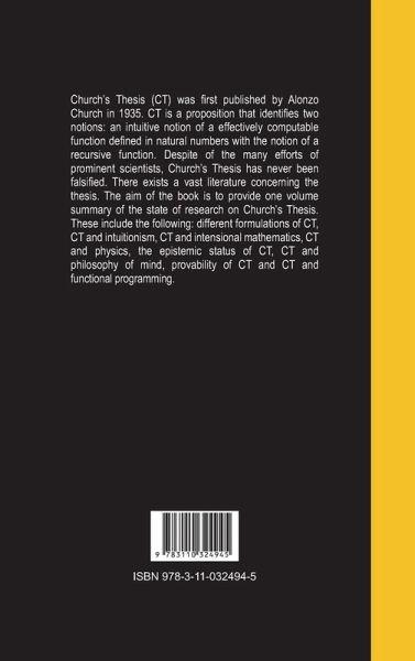 Church's Thesis (CT) was first published by Alonzo Church in 1935. CT is a proposition that identifies two notions: an intuitive notion of a effectively computable function defined in natural numbers with the notion of a recursive function. Despite of the many efforts of prominent scientists, Church's Thesis has never been falsified. There exists a vast literature concerning the thesis. The aim of the book is to provide one volume summary of the state of research on Church's Thesis. These include the following: different formulations of CT, CT and intuitionism, CT and intensional mathematics, CT and physics, the epistemic status of CT, CT and philosophy of mind, provability of CT and CT and functional programming.