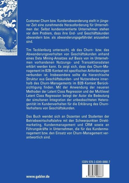 Tim Tecklenburg untersucht, ob das Churn- bzw. das Abwanderungsverhalten von Geschäftskunden anhand eines Data Mining-Ansatzes auf Basis von im Unternehmen vorhandenen Nutzungs- und Transaktionsdaten erklärt werden kann. Es zeigt sich, dass das Churn-Management im B2B-Kontext mit spezifischen Anforderungen verbunden ist. Insbesondere sollte die hierarchische Struktur aus Geschäftskunden- und Nutzerebene innerhalb des Churn-Managements im B2B-Kontext Berücksichtigung finden. Mit der Anwendung der neueren Methoden der Latent Class Regression und der Multilevel Latent Class Regression belegt der Autor die Bedeutung der simultanen Integration der unbeobachteten Heterogenität im Kundenverhalten für die Erklärung des Churn-Verhaltens von Geschäftskunden.