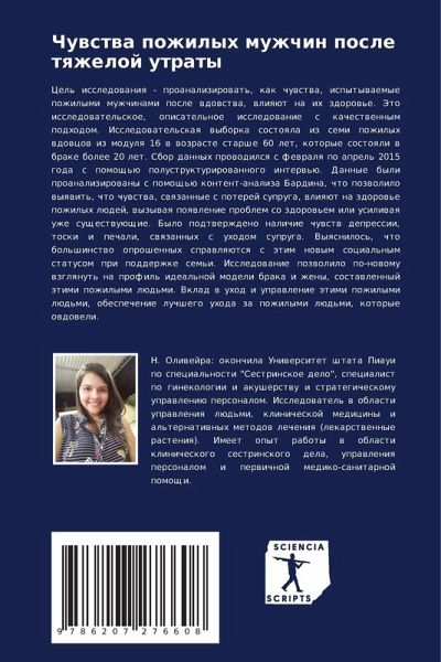 Cel' issledowaniq - proanalizirowat', kak chuwstwa, ispytywaemye pozhilymi muzhchinami posle wdowstwa, wliqüt na ih zdorow'e. Jeto issledowatel'skoe, opisatel'noe issledowanie s kachestwennym podhodom. Issledowatel'skaq wyborka sostoqla iz semi pozhilyh wdowcow iz modulq 16 w wozraste starshe 60 let, kotorye sostoqli w brake bolee 20 let. Sbor dannyh prowodilsq s fewralq po aprel' 2015 goda s pomosch'ü polustrukturirowannogo interw'ü. Dannye byli proanalizirowany s pomosch'ü kontent-analiza Bardina, chto pozwolilo wyqwit', chto chuwstwa, swqzannye s poterej supruga, wliqüt na zdorow'e pozhilyh lüdej, wyzywaq poqwlenie problem so zdorow'em ili usiliwaq uzhe suschestwuüschie. Bylo podtwerzhdeno nalichie chuwstw depressii, toski i pechali, swqzannyh s uhodom supruga. Vyqsnilos', chto bol'shinstwo oproshennyh sprawlqütsq s ätim nowym social'nym statusom pri podderzhke sem'i. Issledowanie pozwolilo po-nowomu wzglqnut' na profil' ideal'noj modeli braka i zheny, sostawlennyj ätimi pozhilymi lüd'mi. Vklad w uhod i uprawlenie ätimi pozhilymi lüd'mi, obespechenie luchshego uhoda za pozhilymi lüd'mi, kotorye owdoweli.