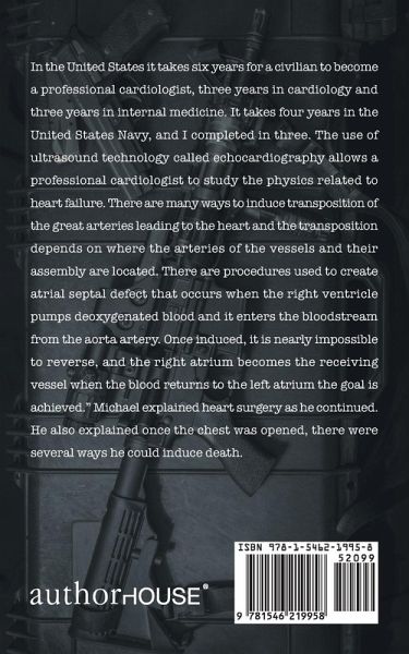 In the United States it takes six years for a civilian to become a professional cardiologist, three years in cardiology and three years in internal medicine. It takes four years in the United States Navy, and I completed in three. The use of ultrasound technology called echocardiography allows a professional cardiologist to study the physics related to heart failure. There are many ways to induce transposition of the great arteries leading to the heart and the transposition depends on where the arteries of the vessels and their assembly are located. There are procedures used to create atrial septal defect that occurs when the right ventricle pumps deoxygenated blood and it enters the bloodstream from the aorta artery. Once induced, it is nearly impossible to reverse, and the right atrium becomes the receiving vessel when the blood returns to the left atrium the goal is achieved." Michael explained heart surgery as he continued. He also explained once the chest was opened, there were several ways he could induce death.