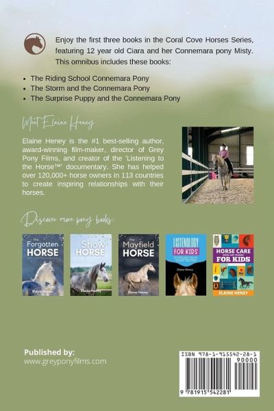 Enjoy the first three books in the Coral Cove Horses Series, featuring 12 year old Ciara and her Connemara pony Misty. This omnibus includes these books: The Riding School Connemara Pony The Storm and the Connemara Pony The Surprise Puppy and the Connemara Pony These wholesome and beautifully told horse stories are perfect for horse-crazy kids and the young at heart. Written by international horsewoman and award-winning documentary director, Elaine Heney, these tender and touching stories explore the depth of the relationship that can be created between girl and horse - that can last a lifetime. Because by listening to the horse everything becomes possible. Perfect for middle school kids who adore horses and all those who love young adult fiction. These enchanting books are full of love, soul and lifelong horsemanship lessons. This is the perfect children's equestrian omnibus book series for young readers, girls, boys, tweens and teens and all who love great horse stories to curl up with and enjoy.