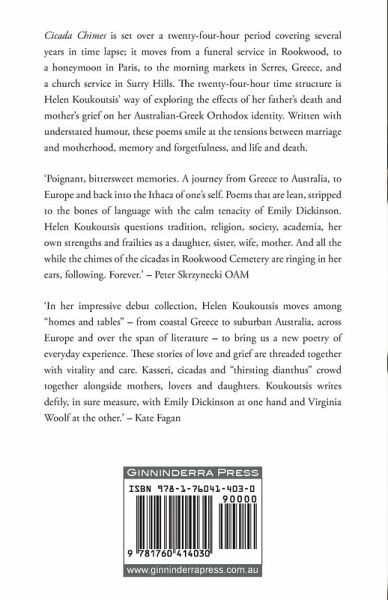 Cicada Chimes is set over a twenty-four-hour period covering several years in time lapse; it moves from a funeral service in Rookwood, to a honeymoon in Paris, to the morning markets in Serres, Greece, and a church service in Surry Hills. The twenty-four-hour time structure is Helen Koukoutsis' way of exploring the effects of her father's death and mother's grief on her Australian-Greek Orthodox identity. Written with understated humour, these poems smile at the tensions between marriage and motherhood, memory and forgetfulness, and life and death. 'Poignant, bittersweet memories. A journey from Greece to Australia, to Europe and back into the Ithaca of one's self. Poems that are lean, stripped to the bones of language with the calm tenacity of Emily Dickinson. Helen Koukoutsis questions tradition, religion, society, academia, her own strengths and frailties as a daughter, sister, wife, mother. And all the while the chimes of the cicadas in Rookwood Cemetery are ringing in her ears, following. Forever.' - Peter Skrzynecki OAM 'In her impressive debut collection, Helen Koukoutsis moves among "homes and tables" - from coastal Greece to suburban Australia, across Europe and over the span of literature - to bring us a new poetry of everyday experience. These stories of love and grief are threaded together with vitality and care. Kasseri, cicadas and "thirsting dianthus" crowd together alongside mothers, lovers and daughters. Koukoutsis writes deftly, in sure measure, with Emily Dickinson at one hand and Virginia Woolf at the other.' - Kate Fagan