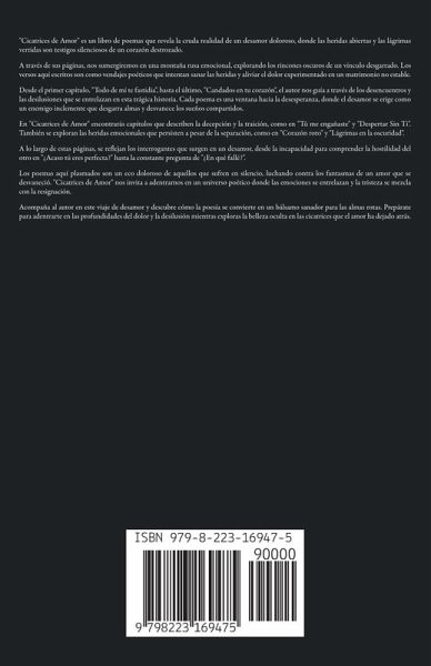 "Cicatrices de Amor" es un libro de poemas que revela la cruda realidad de un desamor doloroso, donde las heridas abiertas y las lágrimas vertidas son testigos silenciosos de un corazón destrozado. A través de sus páginas, nos sumergiremos en una montaña rusa emocional, explorando los rincones oscuros de un vínculo desgarrado. Los versos aquí escritos son como vendajes poéticos que intentan sanar las heridas y aliviar el dolor experimentado en un matrimonio no estable. Desde el primer capítulo, "Todo de mí te fastidia", hasta el último, "Candados en tu corazón", el autor nos guía a través de los desencuentros y las desilusiones que se entrelazan en esta trágica historia. Cada poema es una ventana hacia la desesperanza, donde el desamor se erige como un enemigo inclemente que desgarra almas y desvanece los sueños compartidos. En "Cicatrices de Amor" encontrarás capítulos que describen la decepción y la traición, como en "Tú me engañaste" y "Despertar Sin Ti". También se exploran las heridas emocionales que persisten a pesar de la separación, como en "Corazón roto" y "Lágrimas en la oscuridad". A lo largo de estas páginas, se reflejan los interrogantes que surgen en un desamor, desde la incapacidad para comprender la hostilidad del otro en "¿Acaso tú eres perfecta?" hasta la constante pregunta de "¿En qué fallé?". Los poemas aquí plasmados son un eco doloroso de aquellos que sufren en silencio, luchando contra los fantasmas de un amor que se desvaneció. "Cicatrices de Amor" nos invita a adentrarnos en un universo poético donde las emociones se entrelazan y la tristeza se mezcla con la resignación. Acompaña al autor en este viaje de desamor y descubre cómo la poesía se convierte en un bálsamo sanador para las almas rotas. Prepárate para adentrarte en las profundidades del dolor y la desilusión mientras exploras la belleza oculta en las cicatrices que el amor ha dejado atrás.