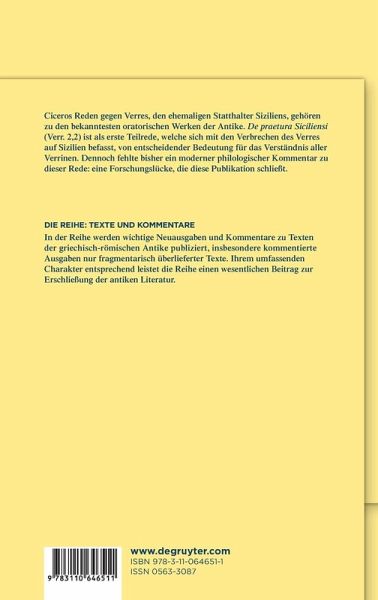 Diese Forschungslücke wird durch den hier vorgelegten Kommentar für De praetura Siciliensi geschlossen. Das zweite Buch der actio secunda ist so unterschiedlichen Themen wie Bestechungen oder Bereicherungen im Zusammenhang mit Zivil- und Kapitalprozessen, Kommunalämtern und Ehrenstatuen sowie der Kooperation mit den Steuerpächtern gewidmet. Der Kommentar berücksichtigt die Erkenntnisse verschiedenster Forschungsdisziplinen, besonders der rechts- und althistorischen Forschung, arbeitet sie kritisch auf und macht sie für das Verständnis der Rede fruchtbar. Vor allem aber beleuchtet er diese Einzelrede erstmals vollständig aus philologischer Sicht, erörtert Sprache, Stil und Textkritik und zeigt vor allem die Raffinesse von Ciceros Redetaktik in dieser Rede und im Zusammenhang des Gesamtkorpus auf.