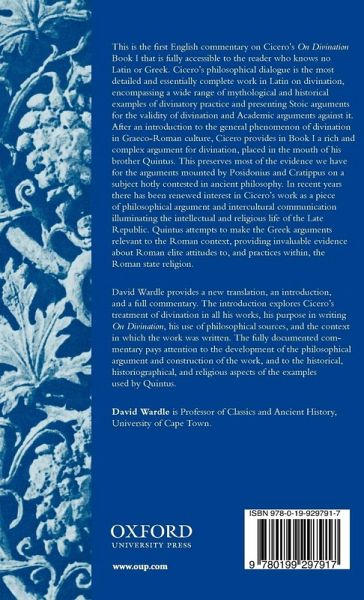 In the two Books of De divinatione Cicero considers beliefs concerning fate and the possibility of prediction: in the first book he puts the (principally Stoic) case for them in the mouth of his brother Quintus; in the second, speaking in his own person, he argues against them. In this new translation of, and commentary on, Book One--the first in English for over 80 years--David Wardle guides the reader through the course of Cicero's argument, giving particular attention to the traditional Roman and the philosophical conception of divination.