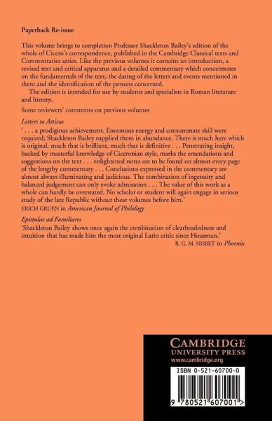 This volume brings to completion Professor Shackleton Bailey's edition of the whole of Cicero's correspondence, published in the Cambridge Classical Texts and Commentaries series. Like the previous volumes it contains an introduction, a revised text and critical apparatus and a detailed commentary which concentrates on the fundamentals of the text, the dating of the letters and events mentioned in them and the identification of the persons concerned. The edition is intended for use by students and specialists in Roman literature and history.
