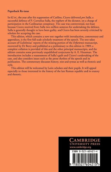 In 62 BC, the year after his suppression of Catiline, Cicero delivered Pro Sulla, a successful defence of P. Cornelius Sulla, the nephew of the dictator, on a charge of participation in the Catilinarian conspiracy. This edition, which contains a new text together with introduction, commentary and appendices, is the first full-scale scholarly treatment of the speech. The text takes account of Gulielmius' reports of the missing portion of the Erfurtensis manuscript, recovered by Dr Berry and published as a preliminary to this edition in 1989; a complete collation is provided of this and the other principal manuscripts. The introduction includes a reassessment of Sulla's guilt and Cicero's undertaking of the case, and also considers issues such as the prose rhythm of the speech and its publication. The commentary discusses history, text and syntax as well as rhetoric and style.