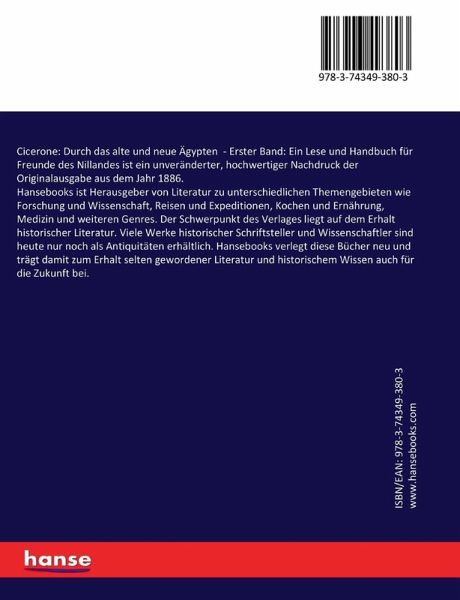 Cicerone: Durch das alte und neue Ägypten - Erster Band: Ein Lese und Handbuch für Freunde des Nillandes ist ein unveränderter, hochwertiger Nachdruck der Originalausgabe aus dem Jahr 1886.