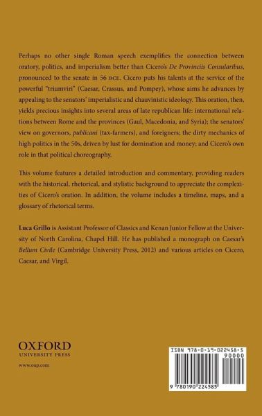 Perhaps no other single Roman speech exemplifies the connection between oratory, politics and imperialism better than Cicero's De Provinciis Consularibus, pronounced to the senate in 56 BC. Cicero puts his talents at the service of the powerful "triumviri" (Caesar, Crassus and Pompey), whose aims he advances by appealing to the senators' imperialistic and chauvinistic ideology. This oration, then, yields precious insights into several areas of late republican life: international relations between Rome and the provinces (Gaul, Macedonia and Judaea); the senators' view on governors, publicani (tax-farmers) and foreigners; the dirty mechanics of high politics in the 50s, driven by lust for domination and money; and Cicero's own role in that political choreography. This speech also exemplifies the exceptional range of Cicero's oratory: the invective against Piso and Gabinius calls for biting irony, the praise of Caesar displays high rhetoric, the rejection of other senators' recommendations is a tour de force of logical and sophisticated argument, and Cicero's justification for his own conduct is embedded in the self-fashioning narrative which is typical of his post reditum speeches. This new commentary includes an updated introduction, which provides the readers with a historical, rhetorical and stylistic background to appreciate the complexities of Cicero's oration, as well as indexes and maps.