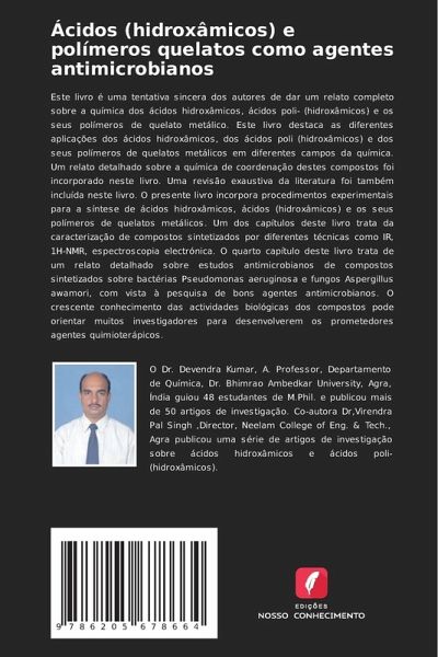 Este livro é uma tentativa sincera dos autores de dar um relato completo sobre a química dos ácidos hidroxâmicos, ácidos poli- (hidroxâmicos) e os seus polímeros de quelato metálico. Este livro destaca as diferentes aplicações dos ácidos hidroxâmicos, dos ácidos poli (hidroxâmicos) e dos seus polímeros de quelatos metálicos em diferentes campos da química. Um relato detalhado sobre a química de coordenação destes compostos foi incorporado neste livro. Uma revisão exaustiva da literatura foi também incluída neste livro. O presente livro incorpora procedimentos experimentais para a síntese de ácidos hidroxâmicos, ácidos (hidroxâmicos) e os seus polímeros de quelatos metálicos. Um dos capítulos deste livro trata da caracterização de compostos sintetizados por diferentes técnicas como IR, 1H-NMR, espectroscopia electrónica. O quarto capítulo deste livro trata de um relato detalhado sobre estudos antimicrobianos de compostos sintetizados sobre bactérias Pseudomonas aeruginosa e fungos Aspergillus awamori, com vista à pesquisa de bons agentes antimicrobianos. O crescente conhecimento das actividades biológicas dos compostos pode orientar muitos investigadores para desenvolverem os prometedores agentes quimioterápicos.
