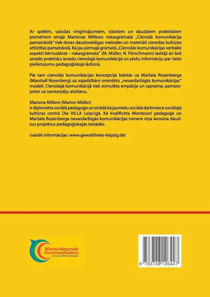 Ar spelem, valodas vingrinajumiem, stastiem un daudziem praktiskiem piemeriem otraja Marionas Milleres rokasgramata "Cienosa komunikacija pamatskola" tiek dotas daudzveidigas metodes un materiali cienosas kulturas attistibai pamatskola. Ka jau pirmaja gramata "Cienosas komunikacijas verbalie aspekti bernudarza - rokasgramata" (M. Mueller, N. Poerschmann) lasitaji ari seit atradis praktisku ievadu cienosaja komunikacija un plasu informaciju par tieso pielietojumu pedagogiskaja ikdiena. Pie tam cienosas komunikacijas koncepcija balstas uz Marsala Rozenberga (Marshall Rosenberg) uz vajadzibam…mehr