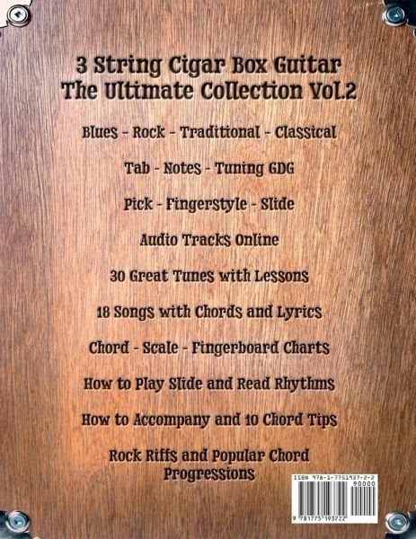 "Cigar Box Guitar The Ultimate Collection: Volume 2." The second book in this series adds more music and instruction needed to learn the three string cigar box guitar tuned to GDG. The book is intended for beginners, but experienced players will gather lots of useful information to further their progress. There is a good selection of tunes that can be played with or without a slide and with or without a pick. As usual, the music includes tablature and notation for those with a music background. There are also 18 traditional songs with chord charts for singers. Each song has suggested chords…mehr
