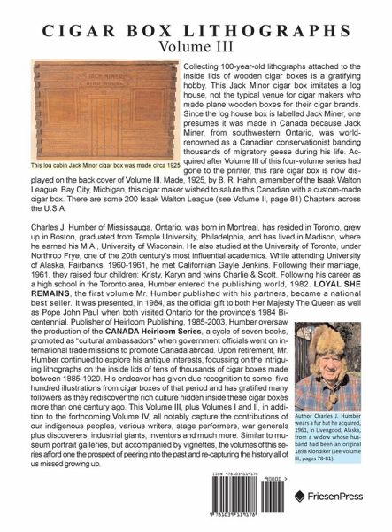 Charles J. Humber of Mississauga, Ontario, was born in Montreal, has resided in Toronto, grew up in Boston, graduated from Temple University, Philadelphia, and has lived in Madison, where he earned his M.A., University of Wisconsin. He also studied at the University of Toronto, under Northrop Frye, one of the 20th century's most influential academics. While attending University of Alaska, Fairbanks, 1960-1961, he met Californian, Gayle Jenkins. Following their marriage, 1961, they raised four children: Kristy, Karyn and twins Charlie & Scott. Following his career as a high school in the Toronto area, Humber entered the publishing world, 1982. LOYAL SHE REMAINS, the first volume Mr. Humber published with his partners, became a national best seller. It was presented, in 1984, as the official gift to both Her Majesty The Queen as well as Pope John Paul when both visited Ontario for the province's 1984 Bicentennial. Publisher of Heirloom Publishing, 1985-2003, Humber oversaw the production of the CANADA Heirloom Series, a cycle of seven books, promoted as "cultural ambassadors" when government officials went on international trade missions to promote Canada abroad. Upon retirement, Mr. Humber continued to explore his antique interests, focussing on the intriguing lithographs on the inside lids of tens of thousands of cigar boxes made between 1885-1920. His endeavor has given due recognition to some five hundred illustrations from cigar boxes of that period and has gratified many followers as they rediscover the rich culture hidden inside these cigar boxes more than one century ago. This Volume III, plus Volumes I and II, in addition to the forthcoming Volume IV, all notably capture the contributions of our indigenous peoples, various writers, stage performers, war generals plus discoverers, industrial giants, inventors and much more. Similar to museum portrait galleries, but accompanied by vignettes, the volumes of this series afford one the prospect of peering into the past and re-capturing the history all of us missed growing up.