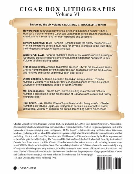 For close to a decade, Charlie Humber's discovery and documentation of the forgotten stories hidden beneath century-old wooden cigar box lids continues. In 2018, the initial volume of his series, headlined Cigar Box Lithographs: The Inside Stories Uncovered, "sparked" Charlie's widely embraced, six-volume series that has attracted a dedicated following both in Canada and abroad. In the latest volume of his acclaimed series, Charlie spiritedly delves into a timely topic: serenading the alluring history of America's Indigenous Peoples. As with his five previous volumes, he pays homage to historical times. Story by story, he utilizes cigar box lithographs as his guideposts to reach his principal objective.