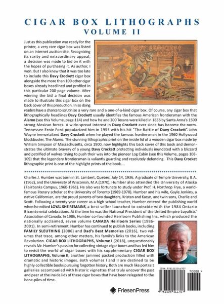 Just as this publication was ready for the printer, a very rare cigar box was listed on an internet auction site. Recognizing its rarity and extraordinary appeal, a decision was made to bid on it with the hopes of purchasing it. As author, I won. But I also knew that it was too late to include this Davy Crockett cigar box alongside the more than 100 other cigar boxes already headlined and profiled in this particular 200-page volume. After winning the bid a final decision was made to illustrate this cigar box on the back cover of this production. In so doing readers have a chance to scrutinize a very rare and a one-of-a-kind cigar box. Of course, any cigar box that lithographically headlines Davy Crockett usually identifies the famous American frontiersman with the Alamo (see this Volume, page 114) and how he and 200 Texans were killed in 1836 by Santa Anna's 1500 strong Mexican forces. A wide-spread interest in Davy Crockett ever since has become the norm. Tennessee Ernie Ford popularized him in 1955 with his hit "The Battle of Davy Crockett". John Wayne immortalized Davy Crockett when he played the famous frontiersman in the 1960 Hollywood blockbuster, The Alamo. The stunning lithographic print on the inside lid of a wooden cigar box made by William Simpson of Massachusetts, circa 1900, now highlights this back cover of this book and demonstrates the ultimate bravery of a young Davy Crockett protecting individuals inundated with a blizzard and petrified of wolves trying to push their way into the pioneer Log Cabin (see this Volume, pages 108- 109) that the legendary frontiersman is valiantly guarding and resolutely defending. This Davy Crocket lithographic print is one of the highlight prints of the book....
