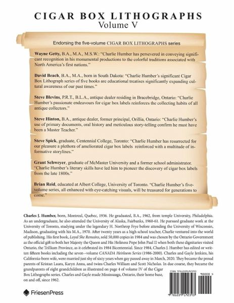 Charles J. Humber of Mississauga, Ontario, was born in Montreal, has resided in Toronto, grew up in Boston, graduated from Temple University, Philadelphia, and has lived in Madison, where he earned his M.A., University of Wisconsin. He also studied at the University of Toronto, under Northrop Frye, one of the 20th century's most influential academics. While attending University of Alaska, Fairbanks, 1960-1961, he met Californian, Gayle Jenkins. Following their marriage, 1961, they raised four children: Kristy, Karyn and twins Charlie & Scott. Following his career as a high school in the Toronto area, Humber entered the publishing world, 1982. LOYAL SHE REMAINS, the first volume Mr. Humber published with his partners, became a national best seller. It was presented, in 1984, as the official gift to both Her Majesty The Queen as well as Pope John Paul when both visited Ontario for the province's 1984 Bicentennial. Publisher of Heirloom Publishing, 1985-2003, Humber oversaw the production of the CANADA Heirloom Series, a cycle of seven books, promoted as "cultural ambassadors" when government officials went on international trade missions to promote Canada abroad. Upon retirement, Mr. Humber continued to explore his antique interests, focussing on the intriguing lithographs on the inside lids of tens of thousands of cigar boxes made between 1885-1920. His endeavor has given due recognition to some five hundred illustrations from cigar boxes of that period and has gratified many followers as they rediscover the rich culture hidden inside these cigar boxes more than one century ago. This Volume III, plus Volumes I and II, in addition to the forthcoming Volume IV, all notably capture the contributions of our indigenous peoples, various writers, stage performers, war generals plus discoverers, industrial giants, inventors and much more. Similar to museum portrait galleries, but accompanied by vignettes, the volumes of this series afford one the prospect of peering into the past and re-capturing the history all of us missed growing up.