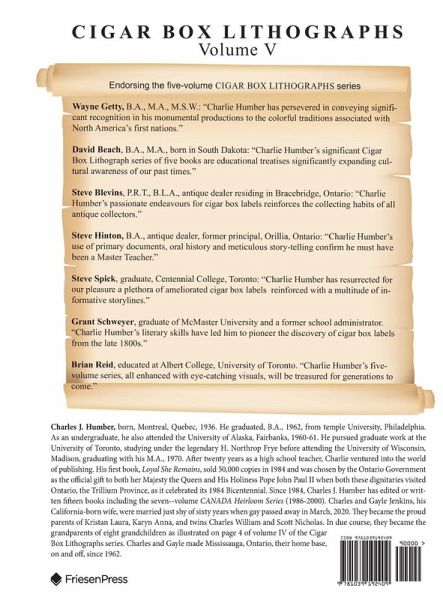 Charles J. Humber of Mississauga, Ontario, was born in Montreal, has resided in Toronto, grew up in Boston, graduated from Temple University, Philadelphia, and has lived in Madison, where he earned his M.A., University of Wisconsin. He also studied at the University of Toronto, under Northrop Frye, one of the 20th century's most influential academics. While attending University of Alaska, Fairbanks, 1960-1961, he met Californian, Gayle Jenkins. Following their marriage, 1961, they raised four children: Kristy, Karyn and twins Charlie & Scott. Following his career as a high school in the Toronto area, Humber entered the publishing world, 1982. LOYAL SHE REMAINS, the first volume Mr. Humber published with his partners, became a national best seller. It was presented, in 1984, as the official gift to both Her Majesty The Queen as well as Pope John Paul when both visited Ontario for the province's 1984 Bicentennial. Publisher of Heirloom Publishing, 1985-2003, Humber oversaw the production of the CANADA Heirloom Series, a cycle of seven books, promoted as "cultural ambassadors" when government officials went on international trade missions to promote Canada abroad. Upon retirement, Mr. Humber continued to explore his antique interests, focussing on the intriguing lithographs on the inside lids of tens of thousands of cigar boxes made between 1885-1920. His endeavor has given due recognition to some five hundred illustrations from cigar boxes of that period and has gratified many followers as they rediscover the rich culture hidden inside these cigar boxes more than one century ago. This Volume III, plus Volumes I and II, in addition to the forthcoming Volume IV, all notably capture the contributions of our indigenous peoples, various writers, stage performers, war generals plus discoverers, industrial giants, inventors and much more. Similar to museum portrait galleries, but accompanied by vignettes, the volumes of this series afford one the prospect of peering into the past and re-capturing the history all of us missed growing up.