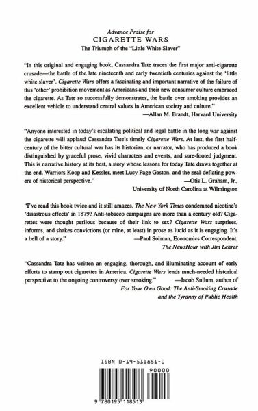Cigarette Wars is a meticulously researched, engagingly written history of the first anti-cigarette movement, dating from the Victorian Age to the Great Depression, when cigarettes were both legally restricted and socially stigmatized in America. At that time, progressive reformers and religious fundamentalists came together to curb smoking, but their efforts collapsed during World War I, when millions of soldiers took up the habit and cigarettes began to be associated with freedom and modernity. Cassandra Tate compellingly shows how supporters of the early anti-cigarette movement articulated virtually every issue that is still being debated about smoking today; theirs was not a failure of determination, she argues in these pages, but of timing.