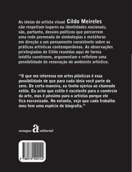 The ideas of visual artist Cildo Meireles do not respect places or national identities; they are, therefore, poetic detours that travel through a network permeated with symbologies and metaphors toward a consistent thought about contemporary artistic practices. Cildo's privileged observations gathered here in an unprecedented way construct, argue, and reflect a possibility of renewal of the artistic environment. "What interests me in fine arts is this possibility that for every idea you start from scratch. In a way, I have an aversion to the so-called style. I think that style is excellent for the art trade, but it is bad for artists because they become enslaved. However, I see that each work of mine has a kind of biography."
