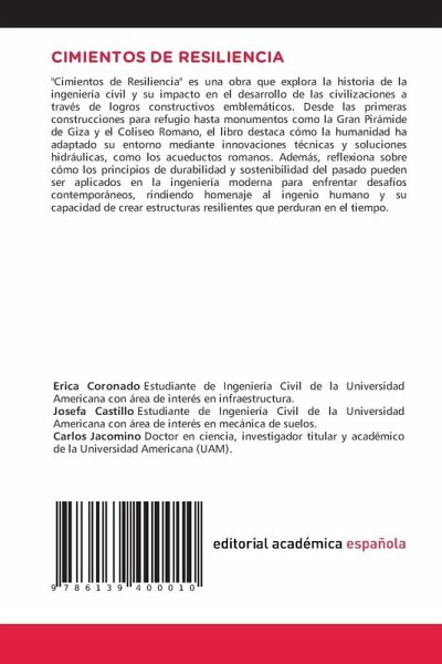 "Cimientos de Resiliencia" es una obra que explora la historia de la ingeniería civil y su impacto en el desarrollo de las civilizaciones a través de logros constructivos emblemáticos. Desde las primeras construcciones para refugio hasta monumentos como la Gran Pirámide de Giza y el Coliseo Romano, el libro destaca cómo la humanidad ha adaptado su entorno mediante innovaciones técnicas y soluciones hidráulicas, como los acueductos romanos. Además, reflexiona sobre cómo los principios de durabilidad y sostenibilidad del pasado pueden ser aplicados en la ingeniería moderna para enfrentar desafíos contemporáneos, rindiendo homenaje al ingenio humano y su capacidad de crear estructuras resilientes que perduran en el tiempo.