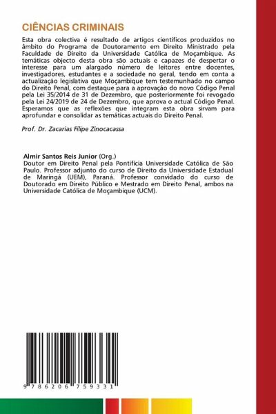 Esta obra colectiva é resultado de artigos científicos produzidos no âmbito do Programa de Doutoramento em Direito Ministrado pela Faculdade de Direito da Universidade Católica de Moçambique. As temáticas objecto desta obra são actuais e capazes de despertar o interesse para um alargado número de leitores entre docentes, investigadores, estudantes e a sociedade no geral, tendo em conta a actualização legislativa que Moçambique tem testemunhado no campo do Direito Penal, com destaque para a aprovação do novo Código Penal pela Lei 35/2014 de 31 de Dezembro, que posteriormente foi revogado pela Lei 24/2019 de 24 de Dezembro, que aprova o actual Código Penal. Esperamos que as reflexões que integram esta obra sirvam para aprofundar e consolidar as temáticas actuais do Direito Penal. Prof. Dr. Zacarias Filipe Zinocacassa
