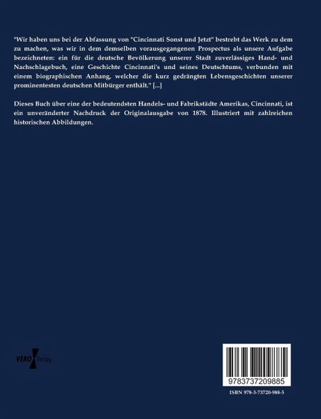 "Wir haben uns bei der Abfassung von "Cincinnati Sonst und Jetzt" bestrebt das Werk zu dem zu machen, was wir in dem demselben vorausgegangenen Prospectus als unsere Aufgabe bezeichneten: ein für die deutsche Bevölkerung unserer Stadt zuverlässiges Hand- und Nachschlagebuch, eine Geschichte Cincinnati's und seines Deutschtums, verbunden mit einem biographischen Anhang, welcher die kurz gedrängten Lebensgeschichten unserer prominentesten deutschen Mitbürger enthält." [...]