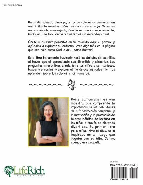 En un día soleado, cinco pajaritos de colores se embarcan en una brillante aventura. Carl es un cardenal rojo, Oscar es un oropéndola anaranjada, Connie es una canaria amarilla, Patsy es una lora verde y Buster es un arrendajo azul. Únete a los cinco pajaritos en su colorido viaje al parque y ayúdalos a explorar su entorno. ¿Ves algo más en la página que sea rojo como Carl o azul como Buster? Este libro bellamente ilustrado hará las delicias de los niños al hacer que el aprendizaje sea divertido y atractivo. Las preguntas interactivas alentarán a los niños a ser curiosos, buscar y encontrar y explorar el mundo que les rodea mientras aprenden sobre los colores y los números.