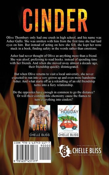 Olive Thornbury only had one crush in high school, and his name was Asher Gallo. She was smitten with him from the first time she had laid eyes on him. But instead of acting on how she felt, she kept her nose stuck in a book, finding safety in the words rather than emotions. Asher had never thought of Olive as anything more than a friend. She was aloof, preferring to read books. instead of spending time with her friends. And when she moved away almost a decade ago, their friendship quickly disintegrated. But when Olive returns to visit a local university, she never expected to run into a very grown up and even more handsome Asher. And what starts off as a rekindling of an old friendship turns into a fiery relationship. Do the opposites have enough in common to go the distance? Or will their combustible chemistry cause the flames to turn everything into cinders?