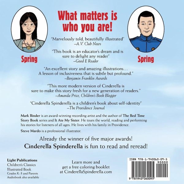 Wicked Stepsisters, a rocking fairy godmother, and a very unusual chauffeur, it's sure to be a family favorite for years to come. You and your children will enjoy the story that has enthralled thousands upon thousands of listeners of all ages and backgrounds for more than a decade! This 52 page illustrated book can be read to Kindergarteners or read by Third graders! Author Mark Binder began creating Cinderella Spinderella when he was telling stories to ethnically diverse audiences in Boston and disabled youngsters in Newport. In the award-winning ebook, there were 25 possible variations. In print, you will chose from one of five seasonal versions: Autumn/African American; Winter/White; Spring/Asian; Summer/Hispanic; and Monsoon/Indian Subcontinent. **This is the Spring/Asian edition! "Marvelously told, beautifully illustrated." -A.V. Club News "An excellent story and amazing illustrations... A lesson of inclusiveness that is subtle but profound." -Benjamin Franklin Award Committee Award-winning author and story performer, Mark Binder has brought Cinderella into the present, with a powerful variation that will be enjoyed by all ages. Awards for the ebook include: - Digital Book World Finalist - Mom's Choice Silver - Ben Franklin Silver