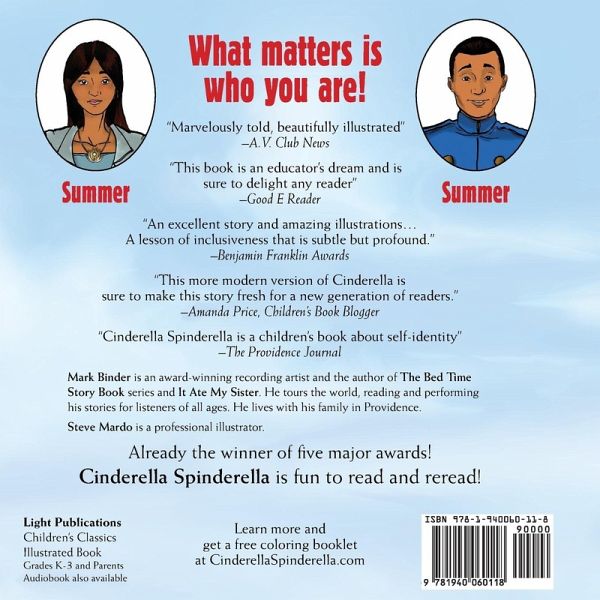 Wicked Stepsisters, a rocking fairy godmother, and a very unusual chauffeur, it's sure to be a family favorite for years to come. You and your children will enjoy the story that has enthralled thousands upon thousands of listeners of all ages and backgrounds for more than a decade! This 52 page illustrated book can be read to Kindergarteners or read by Third graders! Author Mark Binder began creating Cinderella Spinderella when he was telling stories to ethnically diverse audiences in Boston and disabled youngsters in Newport. In the award-winning ebook, there were 25 possible variations. In print, you will chose from one of five seasonal versions: Autumn/African American; Winter/White; Spring/Asian; Summer/Hispanic; and Monsoon/Indian Subcontinent. **This is the Summer/Hispanic edition! "Marvelously told, beautifully illustrated." -A.V. Club News "An excellent story and amazing illustrations... A lesson of inclusiveness that is subtle but profound." -Benjamin Franklin Award Committee Award-winning author and story performer, Mark Binder has brought Cinderella into the present, with a powerful variation that will be enjoyed by all ages. Awards for the ebook include: - Digital Book World Finalist - Mom's Choice Silver - Ben Franklin Silver