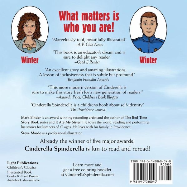 Wicked Stepsisters, a rocking fairy godmother, and a very unusual chauffeur, it's sure to be a family favorite for years to come. You and your children will enjoy the story that has enthralled thousands upon thousands of listeners of all ages and backgrounds for more than a decade! This 52 page illustrated book can be read to Kindergarteners or read by Third graders! Author Mark Binder began creating Cinderella Spinderella when he was telling stories to ethnically diverse audiences in Boston and disabled youngsters in Newport. In the award-winning ebook, there were 25 possible variations. In print, you will chose from one of five seasonal versions: Autumn/African American; Winter/Caucasian; Spring/Asian; Summer/Hispanic; and Monsoon/Indian Subcontinent. **This is the Winter/Caucasian! "Marvelously told, beautifully illustrated." -A.V. Club News "An excellent story and amazing illustrations... A lesson of inclusiveness that is subtle but profound." -Benjamin Franklin Award Committee Award-winning author and story performer, Mark Binder has brought Cinderella into the present, with a powerful variation that will be enjoyed by all ages. Awards for the ebook include: - Digital Book World Finalist - Mom's Choice Silver - Ben Franklin Silver