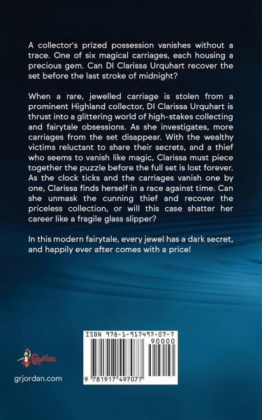 A collector's prized possession vanishes without a trace. One of six magical carriages, each housing a precious gem. Can DI Clarissa Urquhart recover the set before the last stroke of midnight? When a rare, jewelled carriage is stolen from a prominent Highland collector, DI Clarissa Urquhart is thrust into a glittering world of high-stakes collecting and fairytale obsessions. As she investigates, more carriages from the set disappear. With the wealthy victims reluctant to share their secrets, and a thief who seems to vanish like magic, Clarissa must piece together the puzzle before the full set is lost forever. As the clock ticks and the carriages vanish one by one, Clarissa finds herself in a race against time. Can she unmask the cunning thief and recover the priceless collection, or will this case shatter her career like a fragile glass slipper? In this modern fairytale, every jewel has a dark secret, and happily ever after comes with a price!