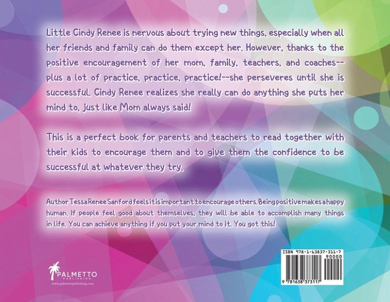 Little Cindy Renee is nervous about trying new things, especially when all her friends and family can do them except her. Then thanks to the positive encouragement of her mom, her family, teachers, and coaches-plus a lot of practice, practice, practice!-she perseveres until she is successful, and realizes she really can do anything she puts her mind to, just like Mom always said! This is a perfect book for parents and teachers to read together with their kids in order to encourage them and give them the confidence to be successful at whatever they try.