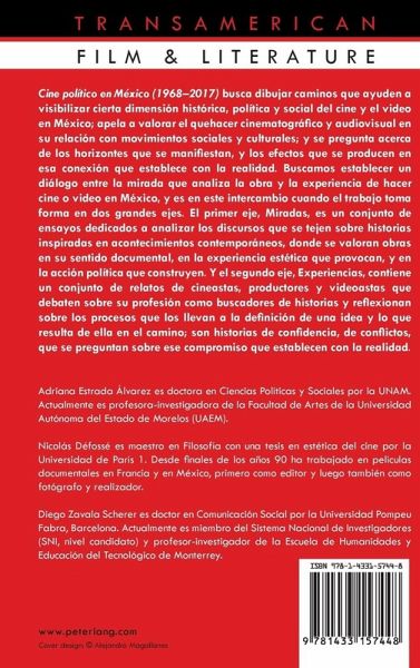 Cine político en México (1968-2017) busca dibujar caminos que ayuden a visibilizar cierta dimensión histórica, política y social del cine y el video en México; apela a valorar el quehacer cinematográfico y audiovisual en su relación con movimientos sociales y culturales; y se pregunta acerca de los horizontes que se manifiestan, y los efectos que se producen en esa conexión que establece con la realidad. Buscamos establecer un diálogo entre la mirada que analiza la obra y la experiencia de hacer cine o video en México, y es en este intercambio cuando el trabajo toma forma en dos grandes ejes. El primer eje, Miradas, es un conjunto de ensayos dedicados a analizar los discursos que se tejen sobre historias inspiradas en acontecimientos contemporáneos, donde se valoran obras en su sentido documental, en la experiencia estética que provocan, y en la acción política que construyen. Y el segundo eje, Experiencias, contiene un conjunto de relatos de cineastas, productores y videoastas que debaten sobre su profesión como buscadores de historias y reflexionan sobre los procesos que los llevan a la definición de una idea y lo que resulta de ella en el camino; son historias de confidencia, de conflictos, que se preguntan sobre ese compromiso que establecen con la realidad.