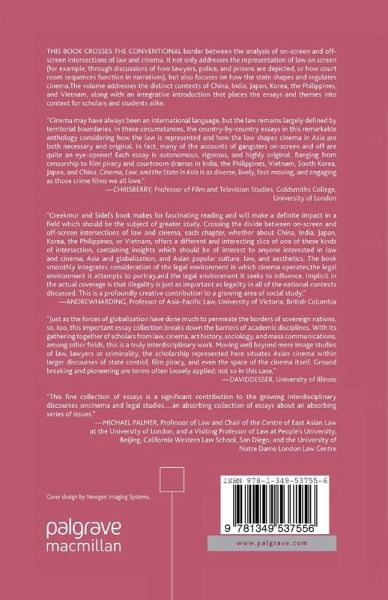 "Cinema may have always been an international language, but the law remains largely defined by territorial boundaries. In these circumstances, the country-by-country essays in this remarkable anthology considering how the law is represented and how the law shapes cinema in Asia are both necessary and original. In fact, many of the accounts of gangsters on-screen and off are quite an eye-opener! Each essay is autonomous, rigorous and highly original. Ranging from censorship to film piracy and courtroom dramas in India, the Philippines, Vietnam, South Korea, Japan and China, Cinema, Law, and the State in Asia is as diverse, lively, fast-moving and engaging as those crime films we all love." - Chris Berry,Professor of Film and Television Studies, Goldsmiths College, University of London'Creekmur and Sidel's book makes for fascinating reading and will make a definite impact in a field which should be the subject of greater study. Crossing the divide between on-screen and off-screen intersections of law and cinema, each chapter, whether about China, India, Japan, Korea, the Philippines, or Vietnam, offers a different and interesting slice of one of these kinds of intersection, containing insights which should be of interest to anyone interested in law and cinema, Asia and globalization, popular culture in Asia, Asian law, or law and aesthetics in Asia. The book smoothly integrates consideration of the legal environment in which cinema operates, the legal environment it attemptsto portray, and the legal environment it seeks to influence. Implicit in the actual coverage is that illegality is just as important as legality in all of the national contexts discussed. This is a profoundly creative contribution to a growing area of social study.'