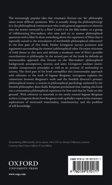 The increasingly popular idea that cinematic fictions can 'do' philosophy raises some difficult questions. Who is actually doing the philosophizing? Is it the philosophical commentator who reads general arguments or theories into the stories conveyed by a film? Could it be the film-maker, or a group of collaborating film-makers, who raise and try to answer philosophical questions with a film? Is there something about the experience of films that is especially suited to the stimulation of worthwhile philosophical reflections? In the first part of this book, Paisley Livingston surveys positions and arguments surrounding the cinema's philosophical value. He raises criticisms of bold theses in this area and defends a moderate view of film's possible contributions to philosophy. In the second part of the book he defends an intentionalist approach that focuses on the film-makers' philosophical background assumptions, sources, and aims. Livingston outlines intentionalist interpretative principles as well as an account of authorship in cinema. The third part of the book exemplifies this intentionalist approach with reference to the work of Ingmar Bergman. Livingston explores the connection between Bergman's work and the Swedish director's primary philosophical source-a treatise in philosophical psychology authored by the Finnish philosopher, Eino Kaila. Bergman proclaimed that reading this book was a tremendous philosophical experience for him and that he 'built on this ground'. With reference to materials in the newly created Ingmar Bergman archive, Livingston shows how Bergman took up Kaila's topics in his cinematic explorations of motivated irrationality, inauthenticity, and the problem of self-knowledge.