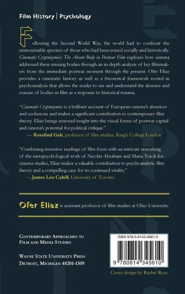 Following World War II, the world had to confront the unmournable specters of those who had been erased socially and historically. Cinematic Cryptonymies: The Absent Body in Postwar Film explores how cinema addressed these missing bodies through an in-depth analysis of key filmmakers from the immediate postwar moment through the present. Ofer Eliaz provides a cinematic history as well as a theoretical framework rooted in psychoanalysis that allows the reader to see and understand the absence and erasure of bodies in film as a response to historical trauma. Drawing on a psychoanalytic technique focused on what one leaves unspoken, Cinematic Cryptonymies investigates a diverse range of postwar film. The first chapter examines how Georges Franju deployed Paris as a city that hides the horrors of its past - here the vanished bodies of the victims of the Holocaust - behind its facade. Eliaz then looks at intergenerational haunting in the early horror films of Mario Bava, in which unacknowledged violence and loss is passed down across generations during the time of Italy's economic miracle. The unique use of montage in the late films of Jean-Luc Godard is the focus of the third chapter, through which the viewer only receives a fragmented and partial image of struggle - an attempt to address the failure of cinema to bear witness to the horrors of the wars and mass killings of the 1990s. Eliaz ends in the 2000s by examining the transnational films of Naomi Uman, whose experimental films engage the violence and loss experienced in different forms of border crossings, including national and social borders. Centered on the question of how one can mourn losses that are so traumatic they become unspeakable, Cinematic Cryptonymies is an important contribution to conversations on postwar film, trauma, and the intersection of psychoanalysis and the humanities. Scholars interested in postwar film and history, trauma and war, or psychoanalytic theory will all find this volume of interest.