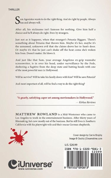 Sam Agonistes wants to do the right thing. And do right by people. Always has and always will. After all, his nickname isn't Samson for nothing. Give him half a chance and he'll always do right. Even by strangers. Just not as it happens, when that stranger's Petunia Biggars. There's something about Petunia that throws him. Maybe it's her, maybe it's the unnamed, unknown evil that she claims drove her to Sam's door. Or maybe it's that he just can't shake off the heat coma she's woken him from. Doesn't matter. He blows it. And just like that Sam, your average Angeleno ex-grip wannabe screenwriter, is in over his head, under surveillance by the Feds, sheltering a fugitive from the deep state and butting heads with one of the most powerful men in Hollywood. Will he survive? Will he take his family down with him? Will he save Petunia? And most important of all, will he find a way to do the right thing?