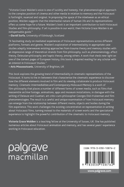 This book explores the growing trend of intermediality in cinematic representations of the Holocaust. It turns to the in-betweens that characterise the cinematic experience to discover how the different elements involved in film and its viewing collaborate to produce Holocaust memory. Cinematic Intermedialities is a work of film-philosophy that places a number of different forms of screen media, such as films that reassemble archive footage, animations, apps and museum installations, in dialogue with the writing of Deleuze and Guattari, art critic-cum-philosopher Georges Didi-Huberman and film phenomenologies. The result is a careful and unique examination of how Holocaust memory can emerge from the relationship between different media, objects and bodies during the film experience. This work challenges the existing concentration on representation in writing about Holocaust films, turning instead to the materials of screen works and the spectatorial experience to highlight the powerful contribution of the cinematic to Holocaust memory.