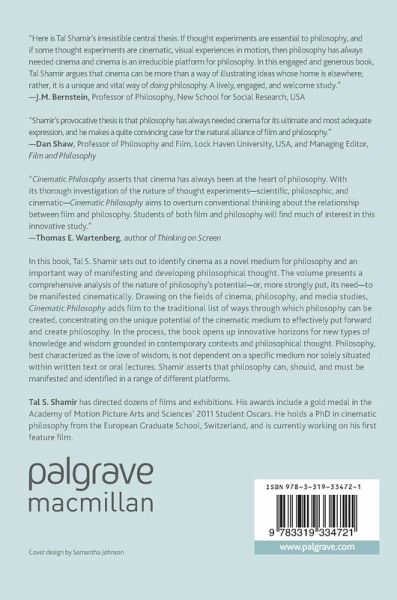 In this book, Tal S. Shamir sets out to identify cinema as a novel medium for philosophy and an important way of manifesting and developing philosophical thought. The volume presents a comprehensive analysis of the nature of philosophy's potential-or, more strongly put, its need-to be manifested cinematically. Drawing on the fields of cinema, philosophy, and media studies, Cinematic Philosophy adds film to the traditional list of ways through which philosophy can be created, concentrating on the unique potential of the cinematic medium to effectively put forward and create philosophy. In the process, the book opens up innovative horizons for new types of knowledge and wisdom grounded in contemporary contexts and philosophical thought. Philosophy, best characterized as the love of wisdom, is not dependent on a specific medium nor solely situated within written text or oral lectures. Shamir asserts that philosophy can, should, and must be manifested and identified in a range of different platforms.