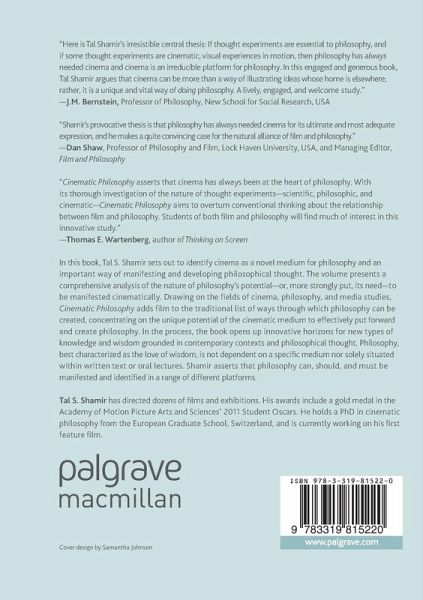 In this book, Tal S. Shamir sets out to identify cinema as a novel medium for philosophy and an important way of manifesting and developing philosophical thought. The volume presents a comprehensive analysis of the nature of philosophy's potential-or, more strongly put, its need-to be manifested cinematically. Drawing on the fields of cinema, philosophy, and media studies, Cinematic Philosophy adds film to the traditional list of ways through which philosophy can be created, concentrating on the unique potential of the cinematic medium to effectively put forward and create philosophy. In the process, the book opens up innovative horizons for new types of knowledge and wisdom grounded in contemporary contexts and philosophical thought. Philosophy, best characterized as the love of wisdom, is not dependent on a specific medium nor solely situated within written text or oral lectures. Shamir asserts that philosophy can, should, and must be manifested and identified in a range of different platforms.
