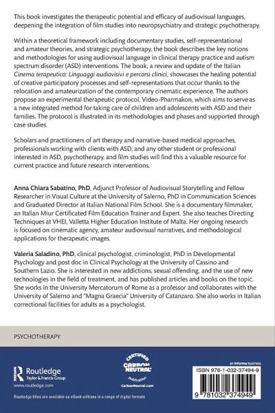 Within a theoretical framework including documentary studies, self-representational and amateur theories, and strategic psychotherapy, the book describes the key notions and methodologies for using audiovisual language in clinical therapy practice and autism spectrum disorder (ASD) interventions. The book, a review and update of the Italian Cinema terapeutico: Linguaggi audiovisivi e percorsi clinici, showcases the healing potential of creative participatory processes and self-representations that occur thanks to the relocation and amateurization of the contemporary cinematic experience. The authors propose an experimental therapeutic protocol, Video-Pharmakon, which aims to serve as a new integrated method for taking care of children and adolescents with ASD and their families. The protocol is illustrated in its methodologies and phases and supported through case studies.