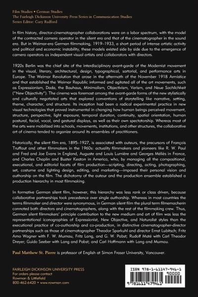 In film history, director-cinematographer collaborations were on a labor spectrum, with the model of the contracted camera operator in the silent era and that of the cinematographer in the sound era. But in Weimar era German filmmaking, 1919-33, a short period of intense artistic activity and political and economic instability, these models existed side by side due to the emergence of camera operators as independent visual artists and collaborators with directors. Berlin in the 1920s was the chief site of the interdisciplinary avant-garde of the Modernist movement in the visual, literary, architectural, design, typographical, sartorial, and performance arts in Europe. The Weimar Revolution that arose in the aftermath of the November 1918 Armistice and that established the Weimar Republic informed and agitated all of the art movements, such as Expressionism, Dada, the Bauhaus, Minimalism, Objectivism, Verism, and Neue Sachlichkeit ("New Objectivity"). Among the avant-garde forms of these new stylistically and culturally negotiated arts, the cinema was foremost and since its inception had been a radical experimental practice in new visual technologies that proved instrumental in changing how human beings perceived movement, structure, perspective, light exposure, temporal duration, continuity, spatial orientation, human postural, facial, vocal, and gestural displays, and their own spectatorship, as well as conventions of storytelling like narrative, setting, theme, character, and structure. Whereas most of the arts mobilized into schools, movements, institutions, and other structures, cinema, a collaborative art, tended to organize around its ensembles of practitioners. Historically, the silent film era, 1895-1927, is associated with auteurs, the precursors of François Truffaut and other filmmakers in the 1960s: actuality filmmakers and pioneers like R. W. Paul and Fred and Joe Evans in England, Auguste and Luis Lumière and Georges Méliès in France, and Charles Chaplin and Buster Keaton in America, who, by managing all the compositional, executional, and editorial facets of film production-scripting, directing, acting, photographing, set, costume, and lighting design, editing, and marketing-imposed their personal vision or authorship on the film. The dichotomy of the auteur and the production ensemble established a production hierarchy in most filmmaking. In formative German silent film, however, this hierarchy was less rank or class driven, because collaborative partnerships took precedence over single authorship. Whereas in silent film production in most countries the terms filmmaker and director were synonymous, in German silent film the plural term filmemacherin connoted both directors and cinematographers, along with the rest of the filmmaking crew. Thus, German silent filmmakers' principle contribution to the new medium and art of film was less the representational iconographies of Expressionist, New Objective, and Naturalist styles than the executional practice of co-authorship and co-production, in distinctive cinematographer-director partnerships such as those of cinematographer Theodor Sparkuhl and director Ernst Lubitsch; Fritz Arno Wagner with F. W. Murnau, Fritz Lang, and G. W. Pabst; Rudolf Maté with Carl Theodor Dreyer; Guido Seeber with Lang and Pabst; and Carl Hoffmann with Lang and Murnau.